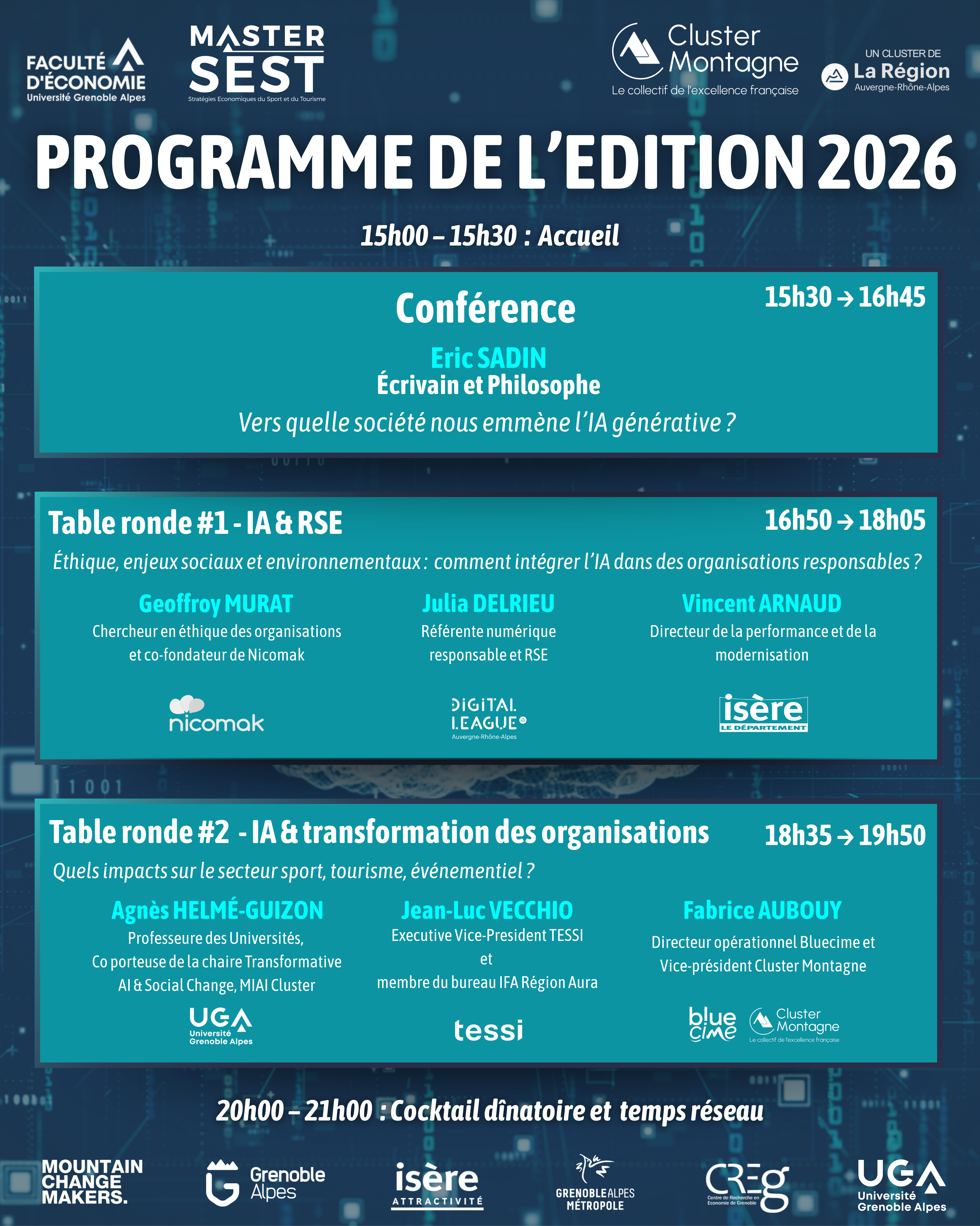 • une table ronde sur le thème IA & transformation des organisations : Quels impacts sur le secteur sport, tourisme et événementiel ?